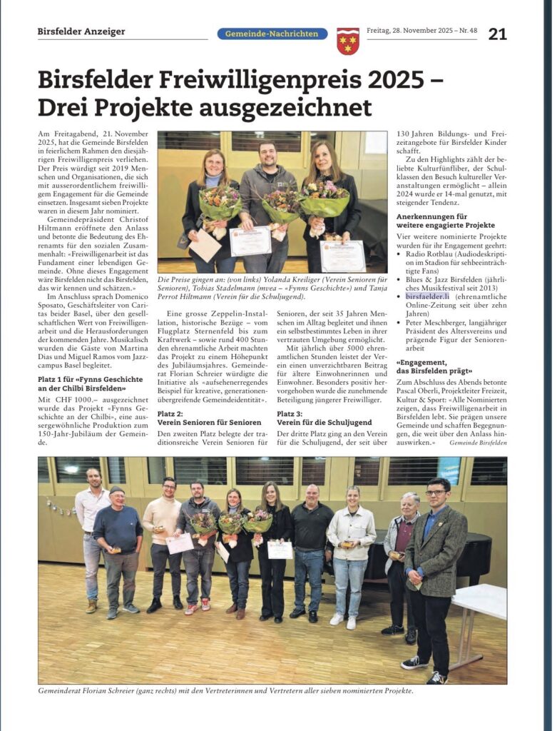 Auch 2025 wurden in der Gemeinde Birsfelden Projekte von Freiwilligen geehrt. Lesen Sie mehr darüber im Artikel des Birsfelder Anzeigers.